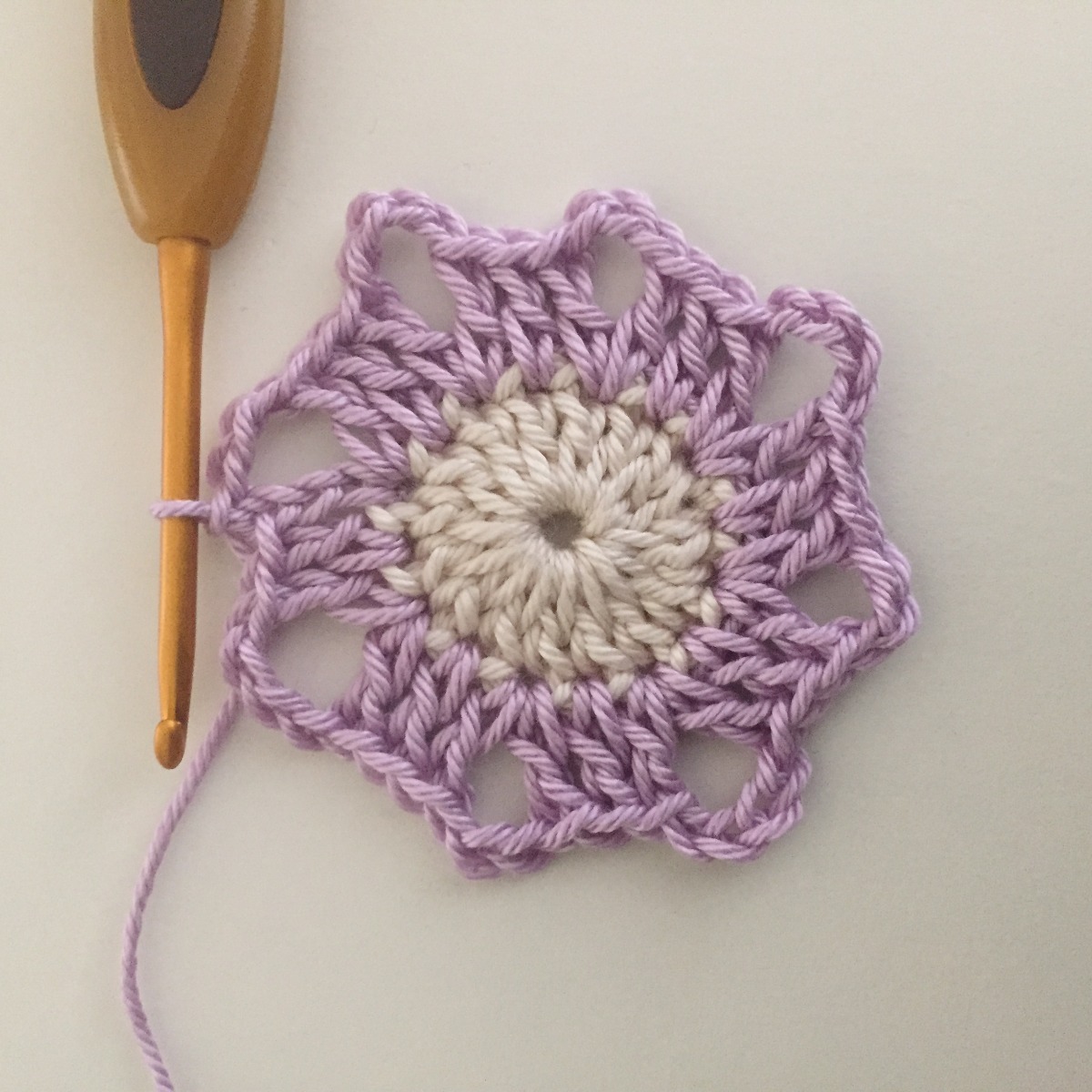 Varv 5: Börja i en 3-lmb. ([2 st, 1 picot, 2 st] i 3-lmb, 5 lm, 1 fm i fm, 5 lm) 8 ggr, avsluta med 1 sm i 3:e lm (alt 1:a st).