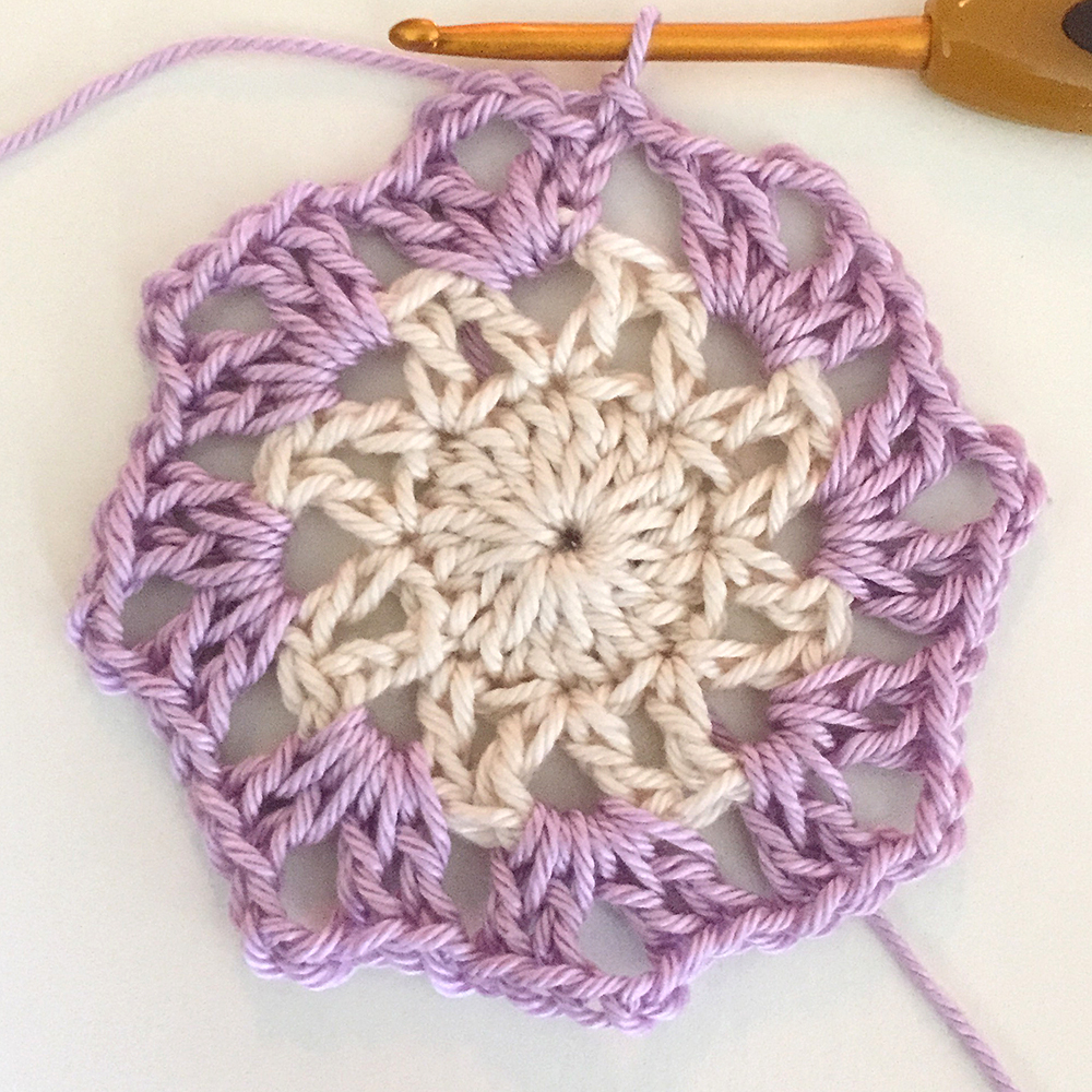 Varv 2: Virka 2 st, ([1 st, 4 lm, 1 st] i nästa st, 1 st i nästa st, [1 st, 3 lm, 1 st] i nästa st, 1 st i nästa st) 3 ggr, [1 st, 4 lm, 1 st] i nästa st, 1 st i nästa st, 1 st i samma st som den 1:a st, 3 lm, avsluta varvet med 1 sm i 3:e lm (alt 1:a st).