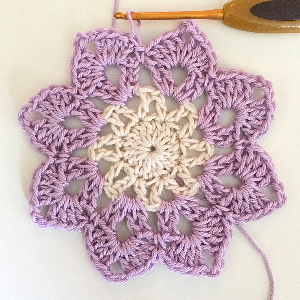 Varv 3: Börja i en 2-lmb. ([2 st, 3 lm, 2 st] i 2-lmb, 1 lm) 8 ggr, avsluta med 1 sm i 3:e lm (alt 1:a st).